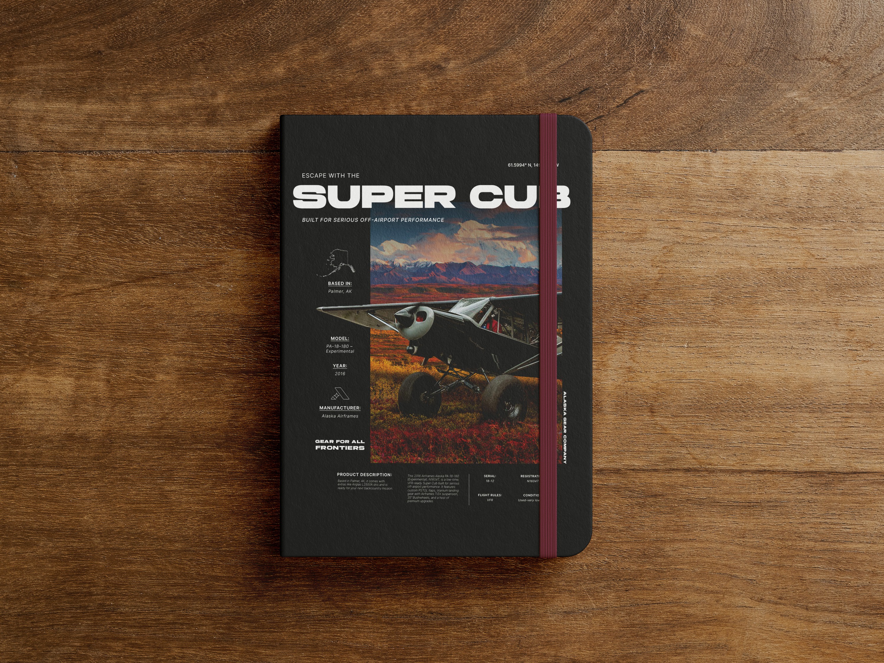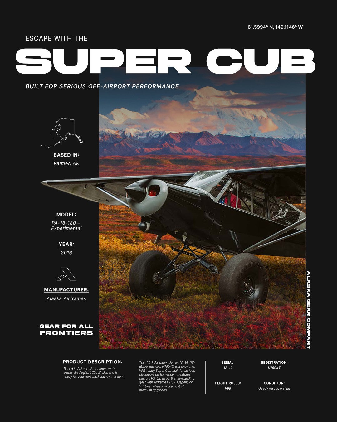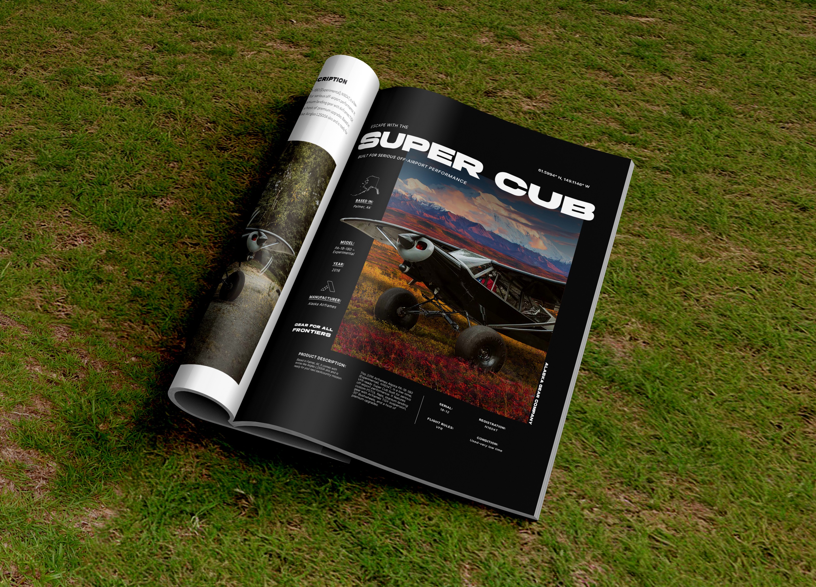 Designed as a flagship promotional asset, this piece was built to translate seamlessly across print, digital, and in-store environments. The layout pulls from premium catalog design, pairing Airframes Alaska’s signature typeface with clean supporting typography and a dramatic Denali backdrop. GPS coordinates for Palmer, Alaska anchor the design to the aircraft’s origin, while the headline Escape With the Super Cub sets an aspirational tone balanced by clear, spec-driven details for technically minded buyers.